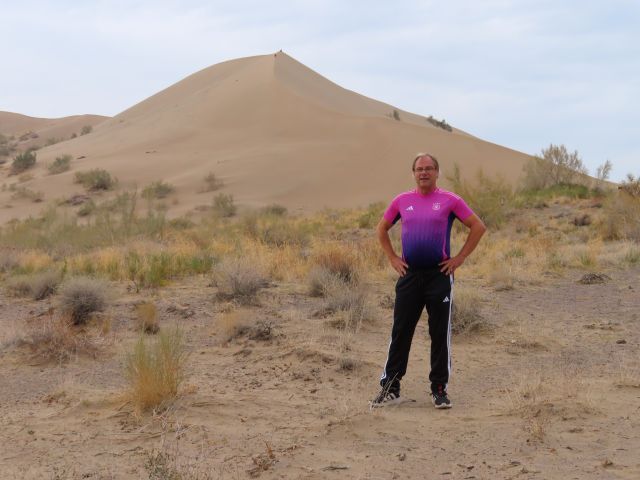 Aufstieg auf die 100e Meter hohen Singenden Sanddünen im Altyn-Emel-Nationalpark. |